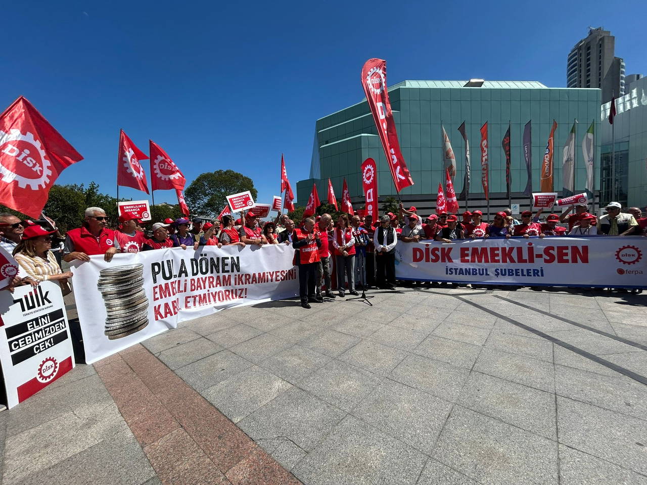 Emekliler, bayram ikramiyeyi olarak hesaplarına yatırılacak 4 bin lirayı DİSK öncülüğünde buluşarak protesto etti. DİSK Genel Başkanı Arzu Çerkezoğlu geçmiş yıllardaki maaş ve ikramiyelerle bugün arasındaki devasa farkların altını çizdi.